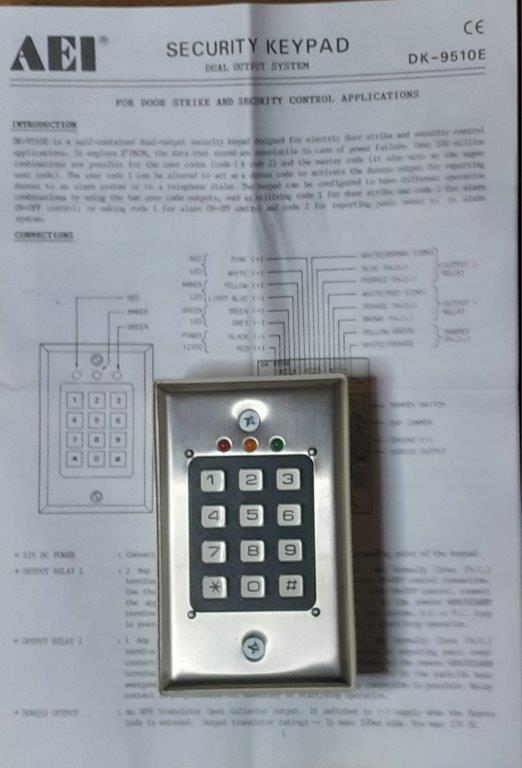 AEI DK-9510E koodilukko 4-numeroisella koodilla ohjelmoitava koodinäppäimistö. Käyttöjännite 12V, relelähtö NC-NO. 3 merkkivaloa osoittaa laitteen tilan: Vihreä = virta kytketty Keltainen = saapumis/poistumisviive (30s.) aktiivinen Punainen = silmukka aktiivinen Mukana silmukanohitusviiveoptio, jolla esim. sivuoven hälytyssilmukka voidaan ohittaa puuttumatta keskuslaitteen asetuksiin. Toki tätä voi käyttää mihin tahansa muuhunkin tarkoitukseen. |